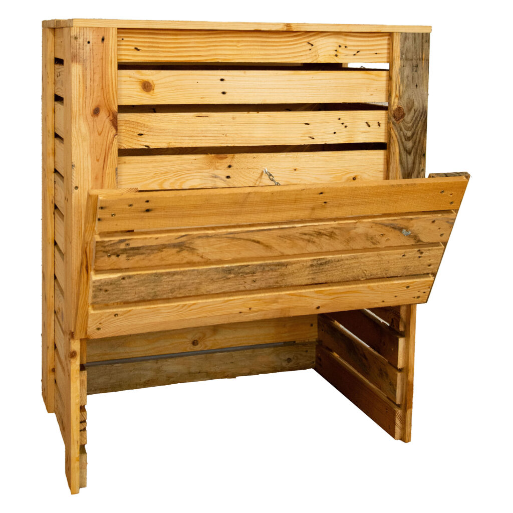 Composteurs fabriqués en bois de palettes non traité, disponibles en trois tailles : petit, moyen ou grand. Idéal pour les jardins, potagers et espaces extérieurs.
