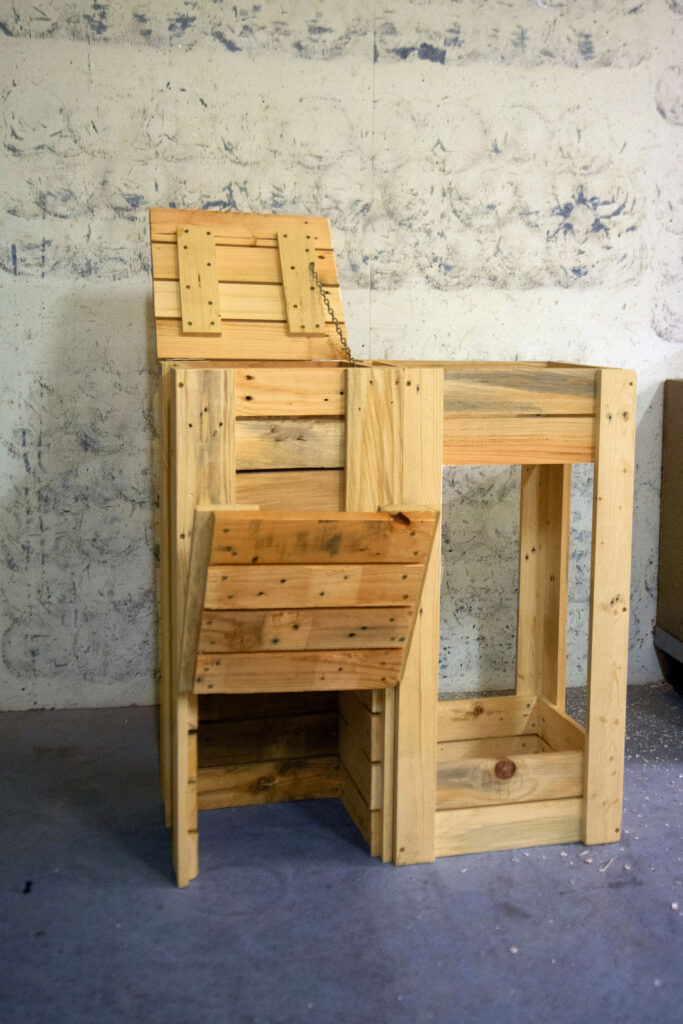 Notre atelier bois travaille exclusivement le bois de palettes non traité, récupéré localement. Nous réalisons des composteurs disponibles en trois tailles, du mobilier de jardin, du mobilier d’intérieur ainsi que des mangeoires et nichoirs pour la biodiversité. Chaque pièce est fabriquée à la main par nos salariés, dans une démarche écologique, locale et solidaire.