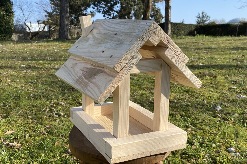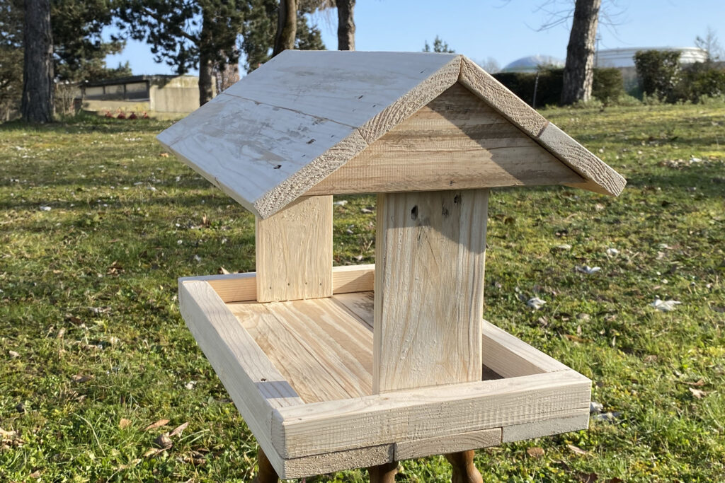 Pour encourager la biodiversité : mangeoires, nichoirs et abris pour oiseaux fabriqués artisanalement. en bois de palettes recyclées et non traitées